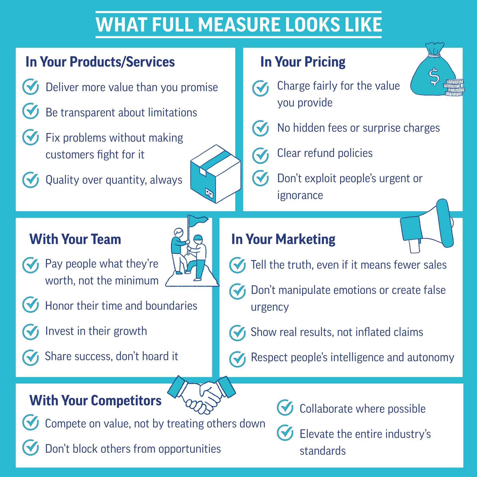 Full Measure and Weight: Stop short-changing people. Whether you’re selling products, services, or time- deliver what you promise. No hidden fees. No bait-and-switch. No “fine print” designed to decieve.